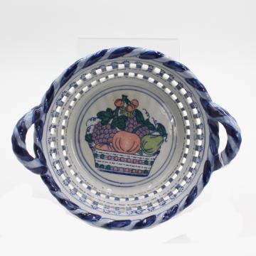 Description: Porcelain pierced basket, styled similar to Capodimonte, decorated with fruit decal, blue and white trim. Marked Ramse Product 44.