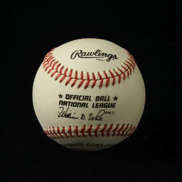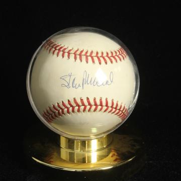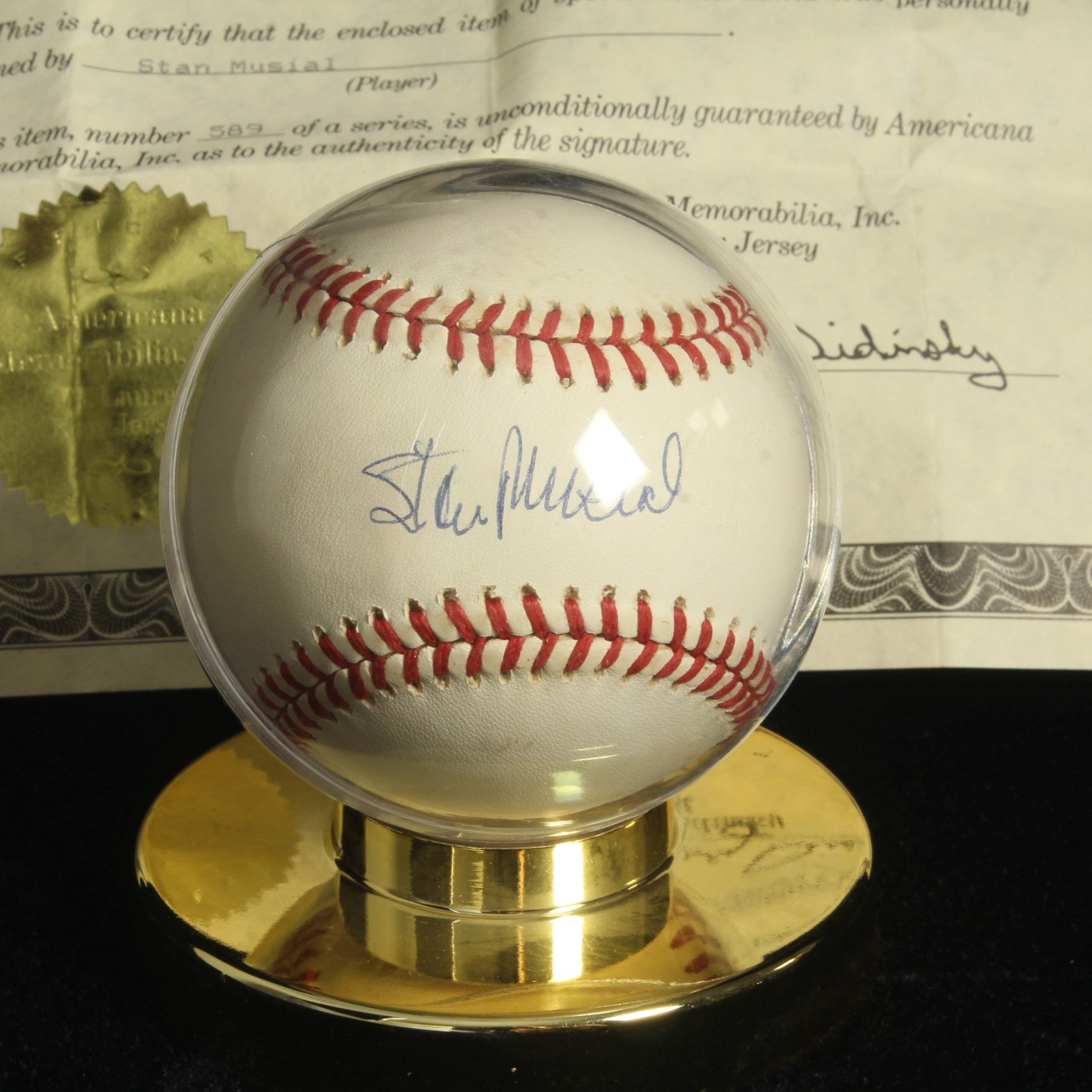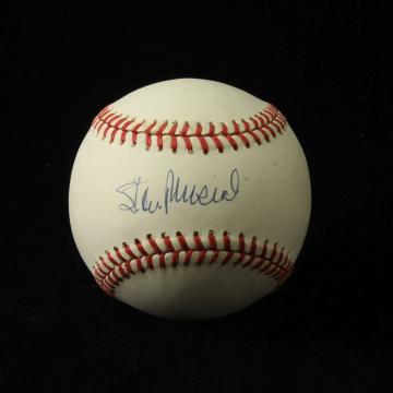 Description: Stan Musiel autographed baseball with CoA. Signed with blue ballpoint ink in the sweet spot. Rawlings, Official Ball, William D. White, National League. Includes acrylic case.