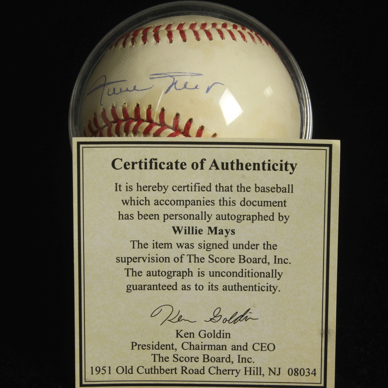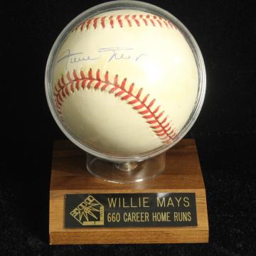 Description: Willie Mays autographed baseball with CoA. Signed with blue ballpoint ink in the sweet spot. Rawlings, Official Ball, William D. White, National League. Includes acrylic case, stand and name plate engraved with "660 Home Runs".