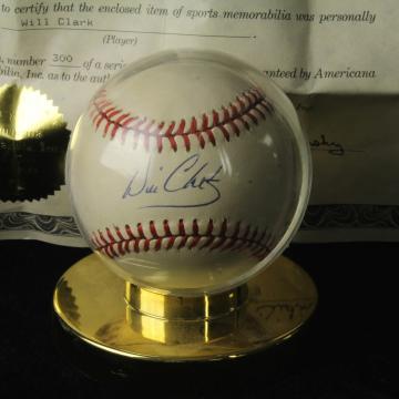 Description: Autographed Will Clark baseball with CoA. Signed in the sweet spot in blue ink. Rawlings, William D. White Official Ball, National League. Includes acrylic case.