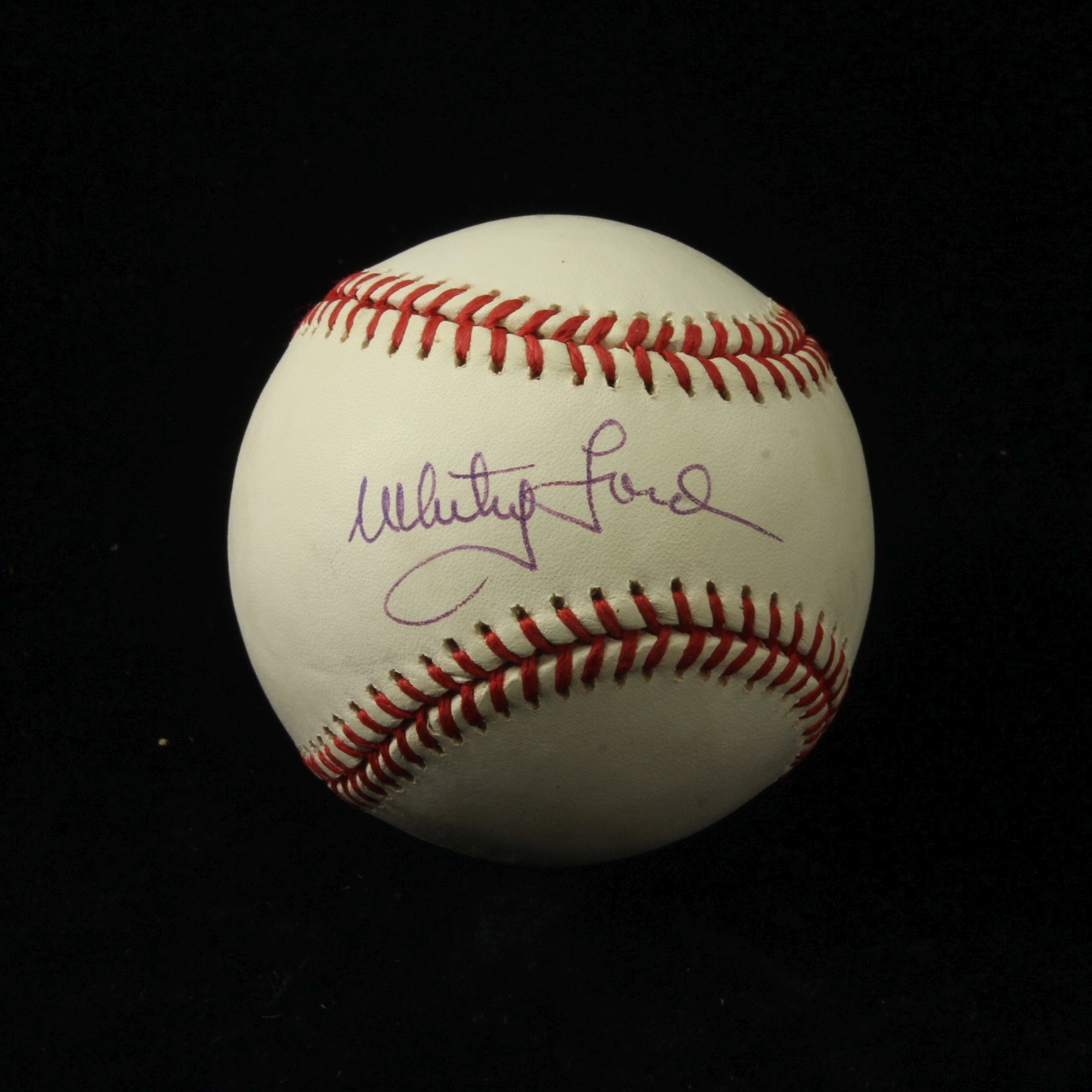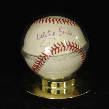 Description: Whitey Ford autographed baseball with CoA. Signed with blue ballpoint ink in the sweet spot. Rawlings, Official Ball, Bobbie Brown, American League.