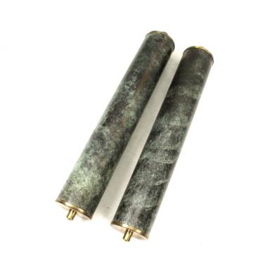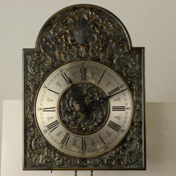 Description: Vintage wall clock with Westminster chime. Bronze finish with Roman numeral face. Clock functions. Pull weights have marble finish. Item is heavy.