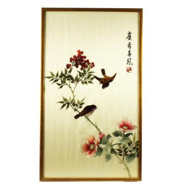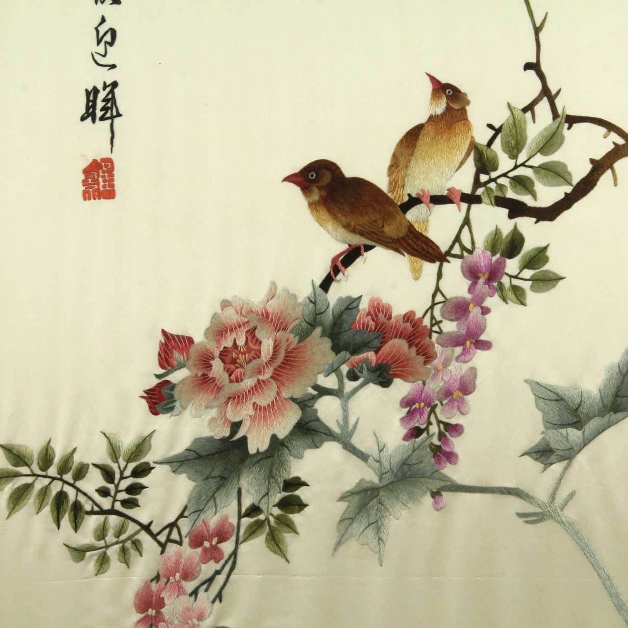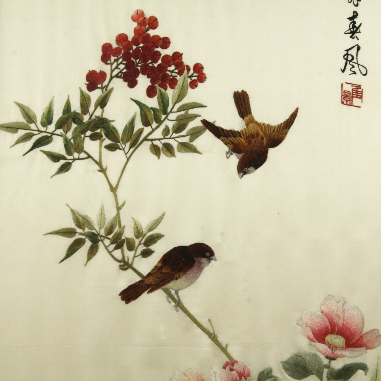 Description: Pair of vintage Chinese silk embroidery picture featuring finches on a bough in blossom. Embrodered on two silk panels. Artists signature and red seal mark.