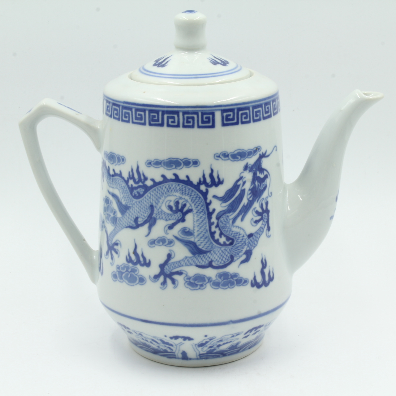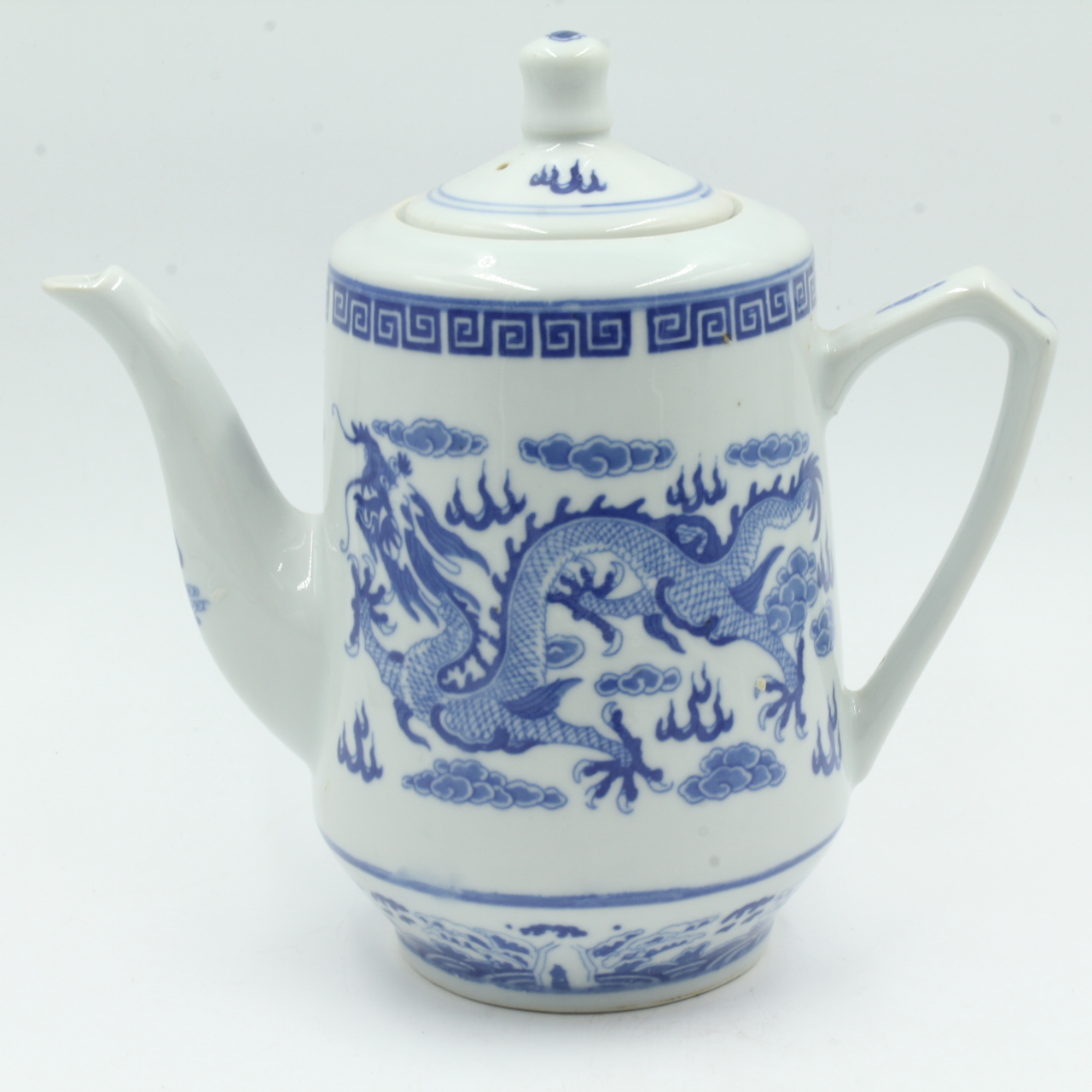 Description: Chinese porcelain teapot in underglaze blue and white. Five clawed dragon design girdles the teapot.