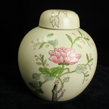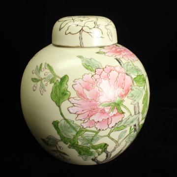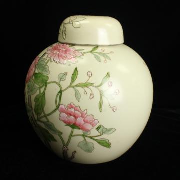 Description: Vintage hand-painted Chinese porcelain jar with lid.