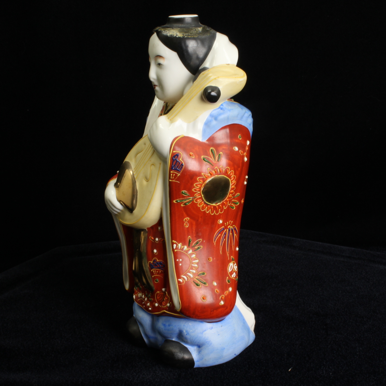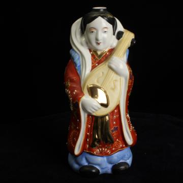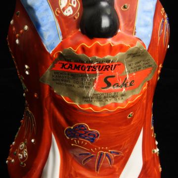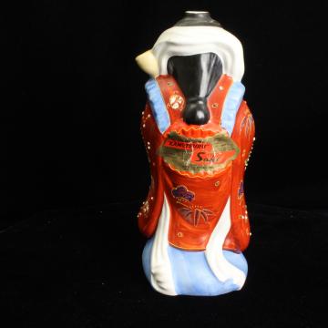 Description: Vintage Kamatsuru same bottle. Figural design featuring a geisha holding a lute.