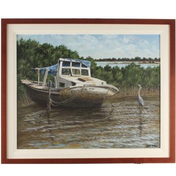 Description: Original acrylic on canvas by Sam Kates depicting a scene from the old Florida Everglades with a hardworking fishing boat and a lone heron.