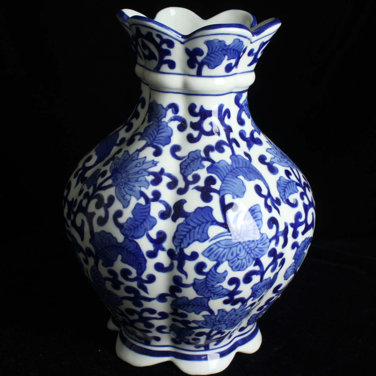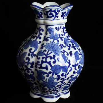 Description: Vintage Chinese underglaze blue and white lobed vase.