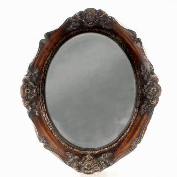 Description: Victorian-style carved wall mirror reproduction in excellent condition. Silver on mirror is clean and bright. Frame does not show any signs of damage.