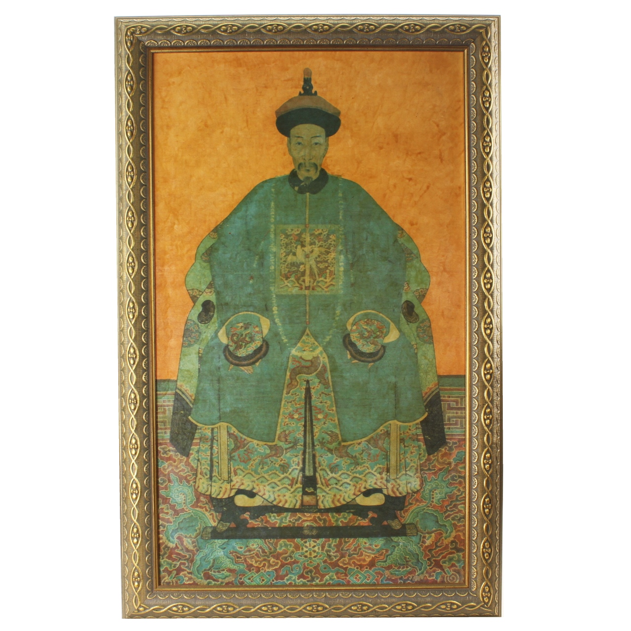 Description: Vintage lithograph of Chinese ancestral painting. This reproduction is of a civil official of the sixth rank in winter dress. Nice gilded frame.