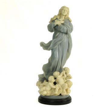 Description: Resin statue of the Assumption Virgin Mary with angels surrounding her at her feet. This is a copy of the Madonna sculpture from the Vittoria Collection made in Italy.