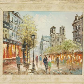 Description: Very nice vintage, C. 1960s, impressionist oil painting by J. Bardot featuring a Parisian street scene and the cathedral of Notre Dame in the background.