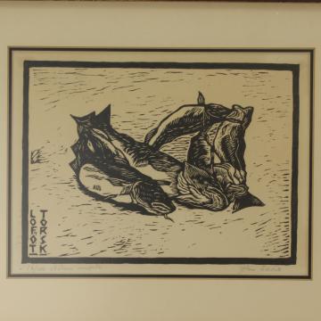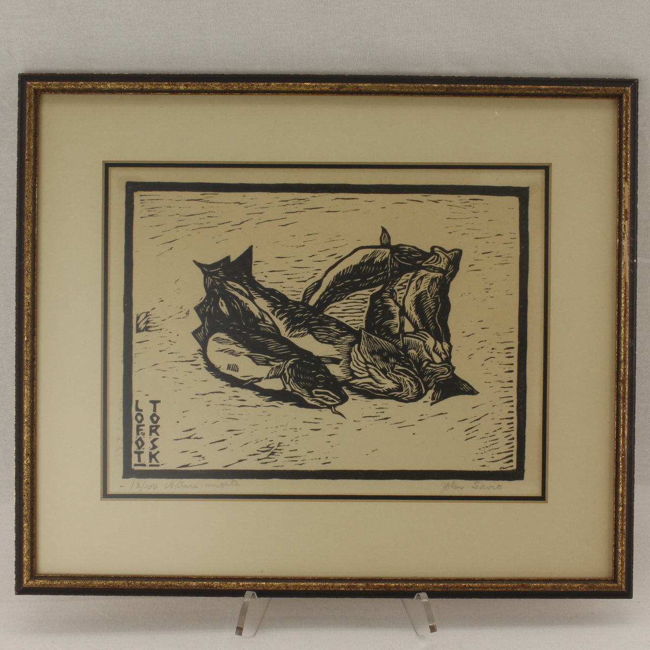 Bio: John Andreas Savio (Norwegian, b.1902-d.1938) was a Sami Lapplander folk artist known for his wood-cut block prints of Norwegian country life.