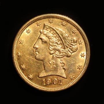 Description: 1901 Liberty Head 5 Dollars Gold (Half Eagle).