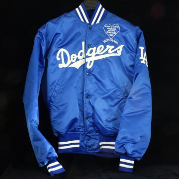 Description: C. 1989 original Dodger royal blue sateen jacket in size XL with seven snap front closure, white Dodgers logo across the front chest with white stitching above to commemorate a benefit event for the Frank and Barbara Sinatra Children's Center at Eisenhower Medical Center. Heart shaped white stitshced logo on left chest reads: