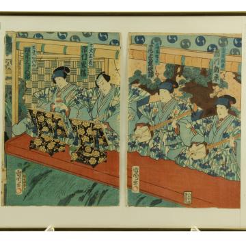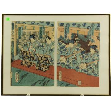 Description: 19th Century Japanese wood block prints in a matted frame. Original ukiyo-e, or "pictures of the floating world," captured the exciting urban, popular culture of the Edo period (1603-1868), promoting its beauty, fashions and heroes.