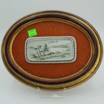 Description: Republic-period Chinese Miniature painted porcelain. Appx 5" in length and framed on orange velvet.