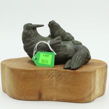 Description: Vintage bronze sculpture walrus mother with pup wood base by John Berryman.
