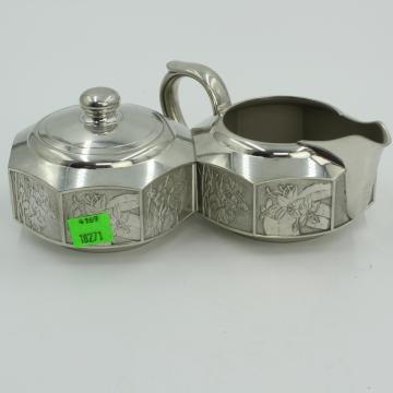 Description: Pewter Cream Sugar, 8-panel floral design, marked Royal Selangor.