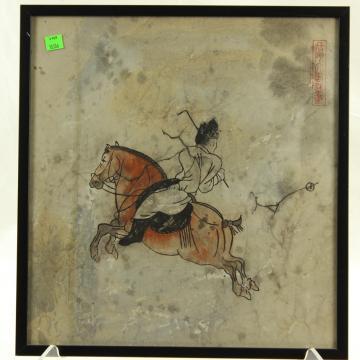 Description: Vintage Chinese print of horse and rider, lithographed.