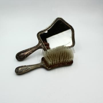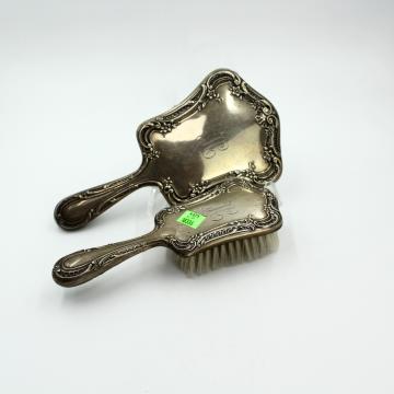 Description: Antique Sterling mounted vanity set with brush and mirror. The back of each head is monogrammed.