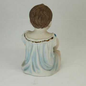 Description: 19th Century porcelain 'Piano Baby'. German original, handpainted baby boy figurine. Very nice bisque and modeling a dark-haired young lad. The atire, fingers and toes are well sculpted with bisque layered under the painted parts unlike late Japanese reproductions. Most likely Gebruder Heubach but is unmarked and un-numbered. Piano babies were created to decorate pianos. Mostly popular in the late 1880s to 1890s, they were still made into the early 1900s.