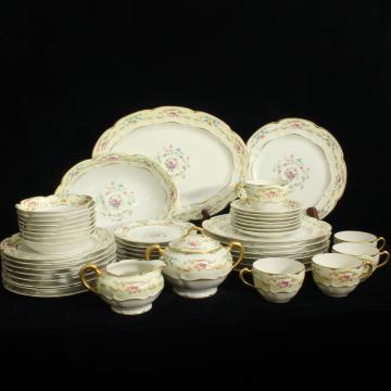 Description: Vintage Haviland Limoges "Rose Bouquet" porcelain 40 piece dinnerware set. Not a complete set but includes 7 saucers, 6 cups, 7 dinner plates, 8 salad plates, 8 small bowls, lidded sugar, creamer, 1 vegetable bowl, 1 platter. All marked Haviland & Co., Limoges France