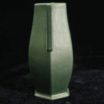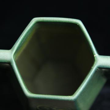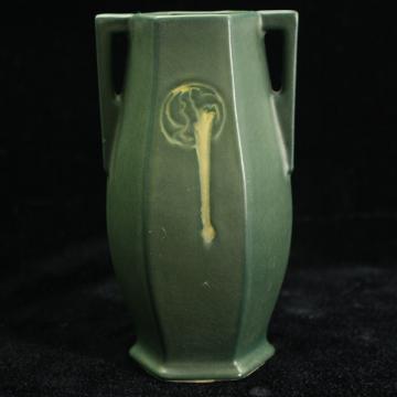 Description: Beautiful C. 1925 Roseville Hexagon vase #269-6 in teal green. Blue underglaze Rv mark on base.