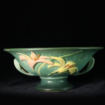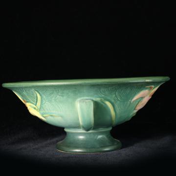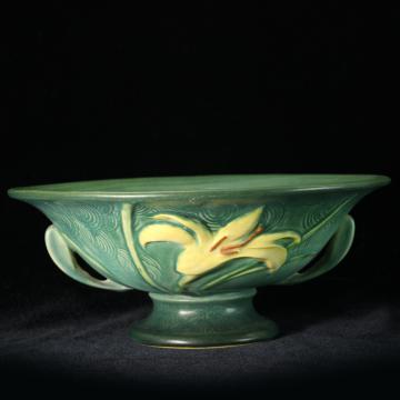 Description: Roseville Pottery Zephyr Lily green compote #8-10. Zephyr Lily was introduced by Roseville Pottery in 1946. Colors included blue, green, and brown. Green is the color most sought after by collectors.