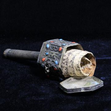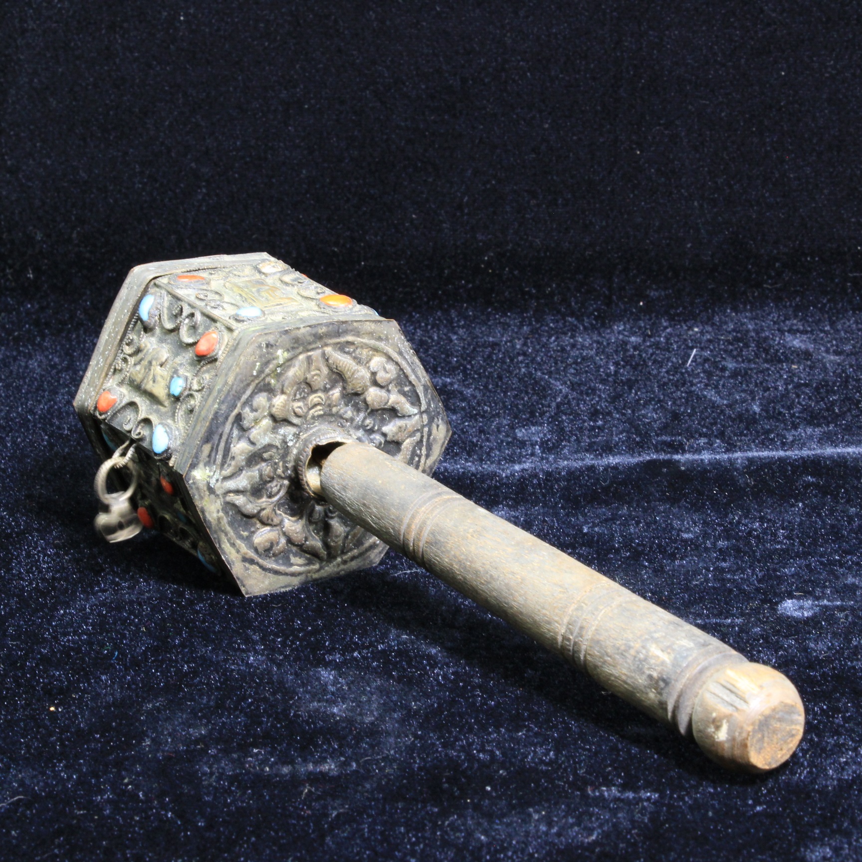 Description: Tibetan prayer wheel with coral and turquoise cabachons set in a hammered copper head. Called Mani wheels by the Tibetans, were used for spreading spiritual blessings and well being. Rolls of thin paper, imprinted with many, many copies of the mantra (prayer) Om Mani Padme Hum, printed in an ancient Indian script or in Tibetan script, are wound around an axle in a protective container, and spun around and around.