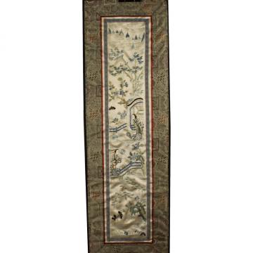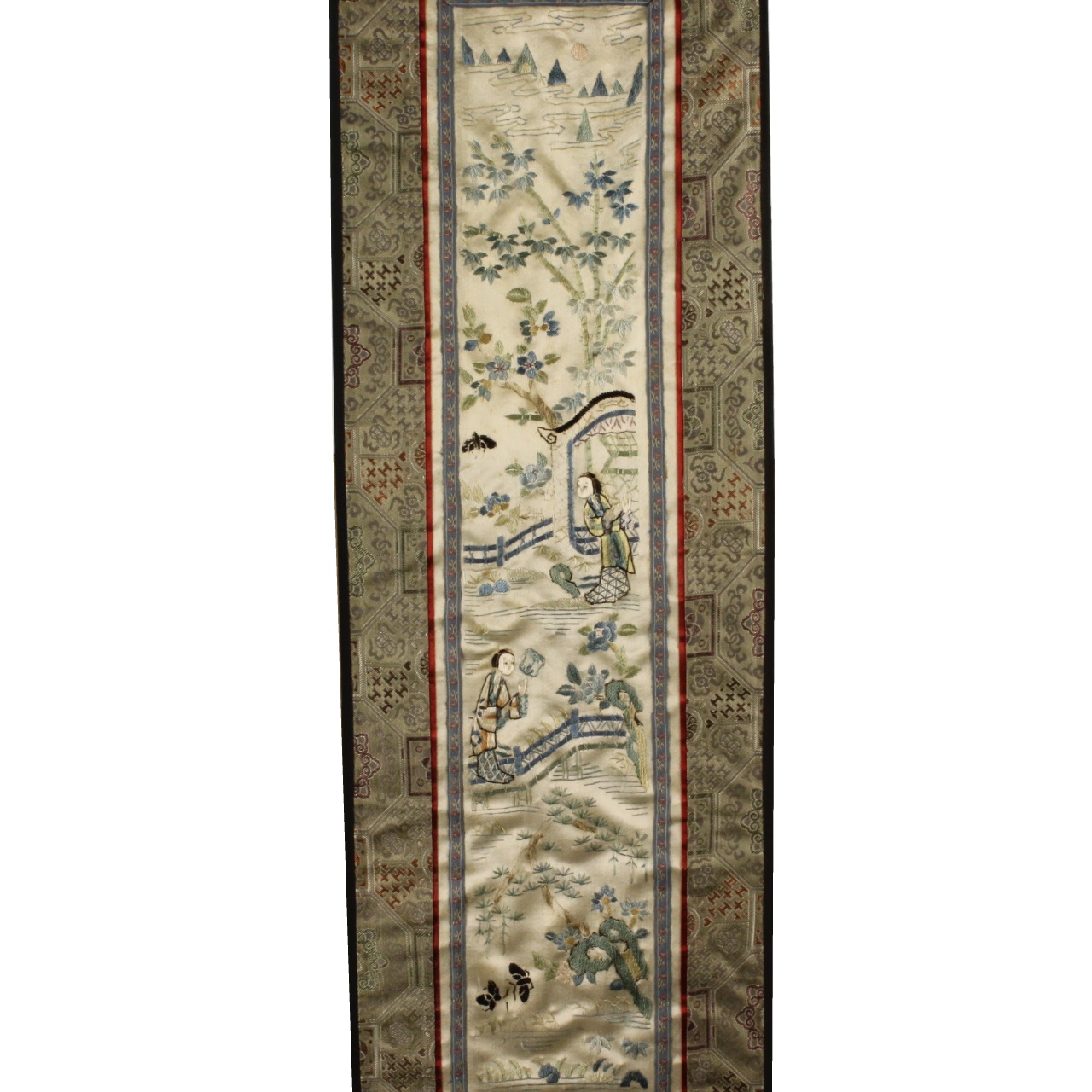 Description: 19th C. Chinese Silk Robe Panel. Featuring young female courtesans. Both female figure has a crown of gold thread. Flowers and bamboo surround the figures in a palace like world with butterflies and blossoms.The embroidered silk brocade is done in shades of tan, red, pale blue and pale jade green.